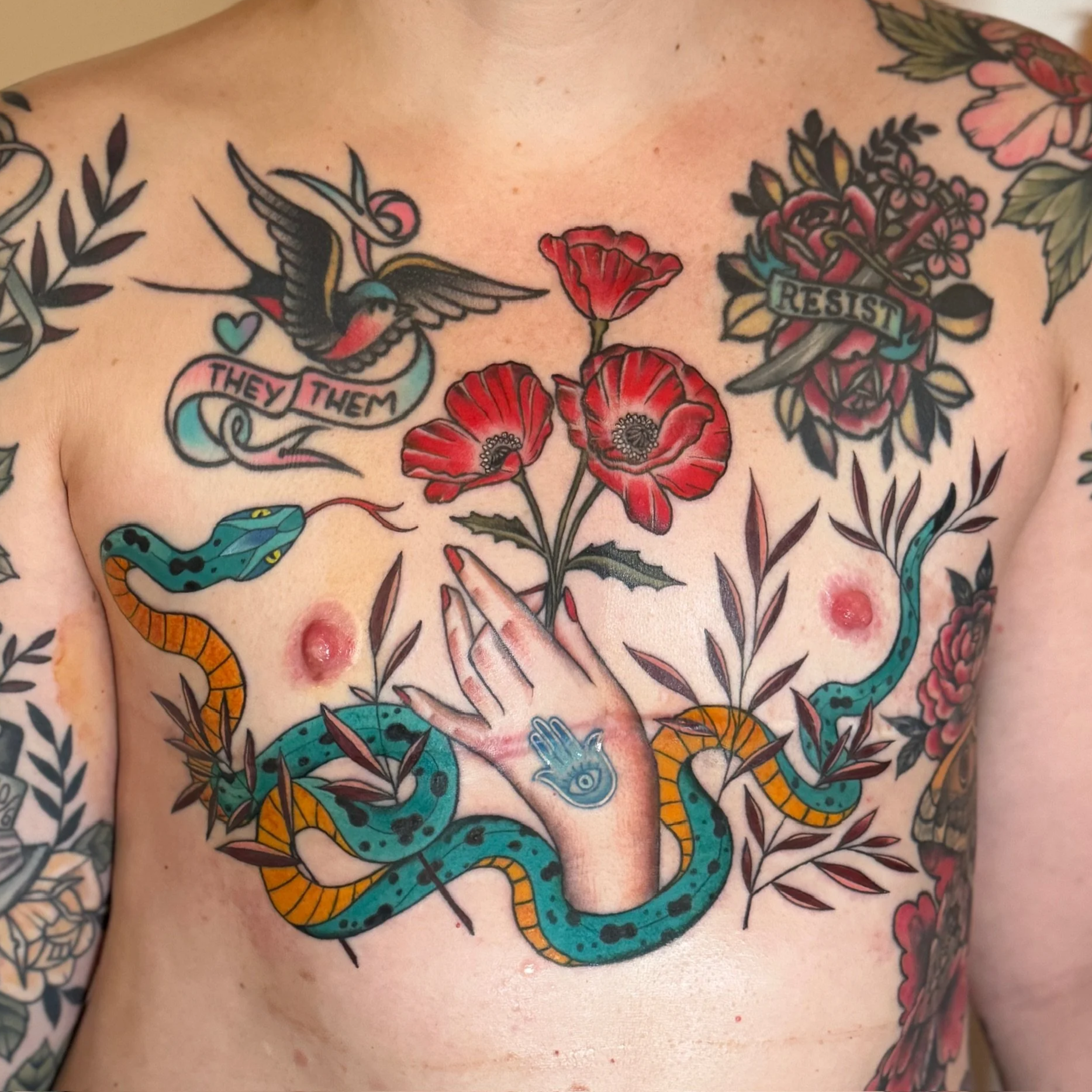 I welcome all bodies and experiences: postpartum, cancer survivors, trans & NB folks, scars and more. All bodies are tattoo bodies.